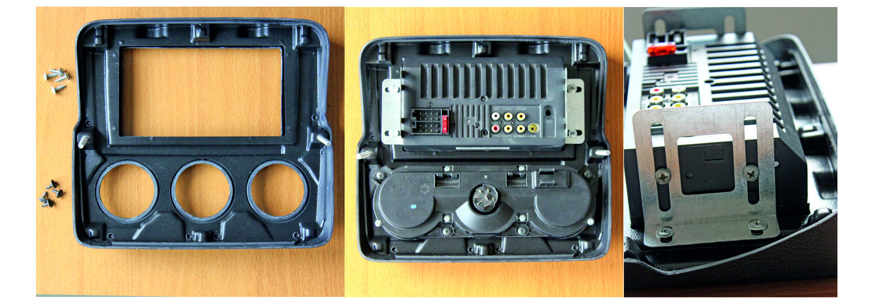 19. Установить штатное головное устройство (магнитолу) на новую накладку с внутренней стороны изделия. Закрепить ее так же с внутренней стороны, используя систему крепления (кронштейны и т.п.), поставляемую в комплекте с магнитолой.