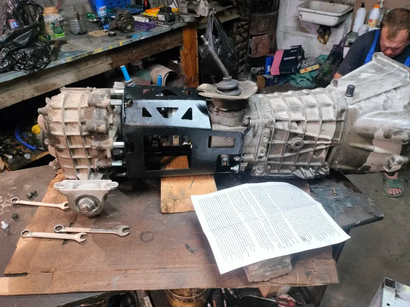 Разборка, снятие агрегатов. В моторном отсеке: откручиваем стартер, (три болта 13)выдвигаем вперед и оставляем его на выхлопной трубе. (на инжекторных удаляем растяжку поддержки впускного коллектора). Ключом 19 откручиваем верхний болт крепления кожуха сцепления к двигателю (выше стартера). В салоне: снимаем сферические ручки с рукояток. Откручиваем саморезы крепления декоративной накладки и удаляем ее. Снимаем рычаг КПП, для этого поддеваем пластиковую втулку внутри рычага чем нибудь острым и вытаскиваем. Снимаем пластиковые крышки технологических отверстий. Отключаем провода датчика блокировки дифференциала. Под автомобилем: снимаем карданы, передний и задний. Чтобы снять раздатку: окручиваем трос спидометра, (на инжекторных отстегиваем провод, сам датчик тоже откручиваем), откручиваем гайки крепления промвала к фланцу РК. Откручиваем гайки крепления подушек РК к кузову. Отодвинув назад, снимаем РК. Чтобы снять КПП; откручиваем два болта крепления цилиндра сцепления и оставляем его подсунув за тягу. Откручиваем два болтика на 10 крепления защиты к кожуху сцепления. Откручиваем три болта на 19 крепления кожуха сцепления к двигателю (в данном случае удобнее всего будет использовать головку с карданным шарниром и удлинителем). Откручиваем гайки крепления кронштейна опоры КПП к кузову. Выдвинув КПП назад, снимаем его. (на инжекторных автомобилях с катализатором необходимо снять стабилизатор).