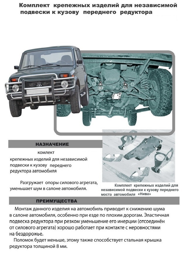 Комплект пригоден как для самостоятельной установки, так и для установки на фирмах, занимающихся тюнингом всеми любимой "Лада 4х4".