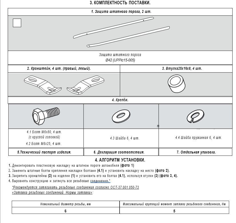 Пороги поставляется с комплектом переходных кронштейнов и необходимым количеством болтов, гаек и шайб для установки изделия на автомобиль. Понятная инструкция по установке и рекомендации по уходу за изделием.