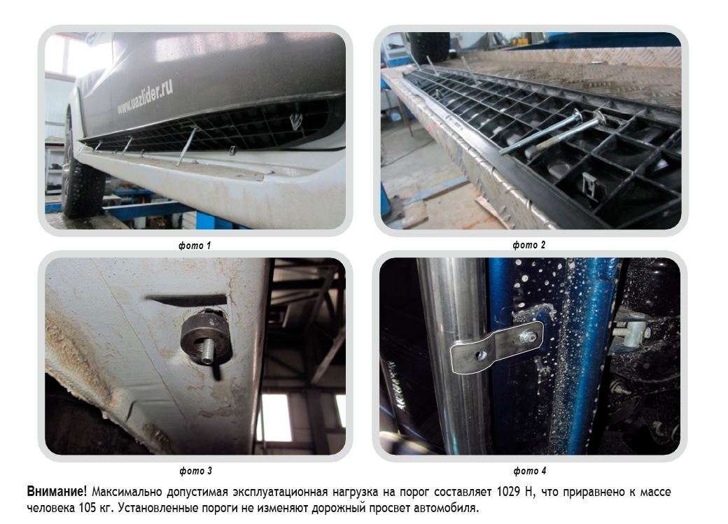 Максимально допустимая эксплуатационная нагрузка на порог составляет 1029 Н, что приравнено к массе человека 105 кг. Установленные пороги не изменяют дорожный просвет автомобиля.