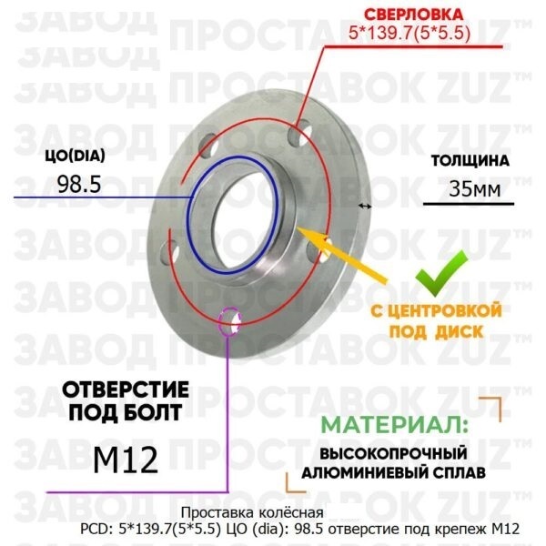 Проставки колёсные алюминиевые с крепежом толщиной 25/30/35/40мм PCD: 5*139.7 ЦО (DIA): 98,5 отверстие под крепёж M12