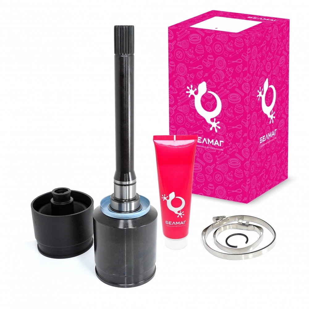 В наружных ШРУСах «БелМаг» применена классическая конструкция с сепаратором и шариками. Шарнир этой конструкции работает как коническая шестеренка, но вместо зубьев шестеренки, передающих момент кручения по шарниру, используются шарики, которые действуют на свои дорожки во внутреннем и наружном корпусах.