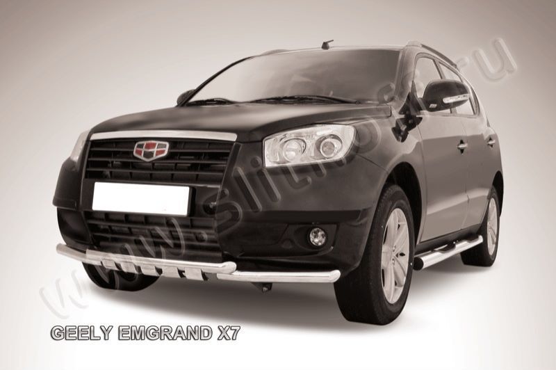 Защита переднего бампера Geely Emgrand X7 (2011-2016) состоит из 2-х труб, изготовленных из нержавеющей стали диаметрами 57 и 57 мм. с профильной защитой картера. Надежное крепление к кузову автомобиля. Установка без сверления кузова. Цвет окраски: черный. Изготовление по предварительному заказу. Гарантия качества!