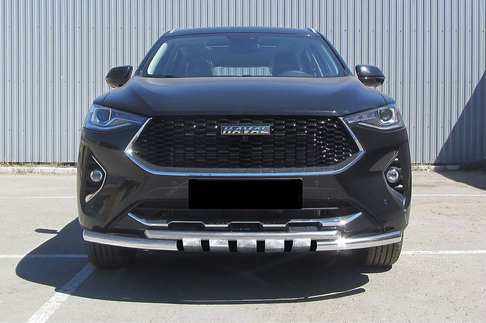 Защита переднего бампера Haval F7 F7x (2019-2023) состоит из 2-х труб, изготовленных из нержавеющей стали диаметрами 57 и 57 мм. с декоративными элементами. Надежное крепление к кузову автомобиля. Установка без сверления кузова. Цвет окраски: черный. Изготовление по предварительному заказу. Гарантия качества!