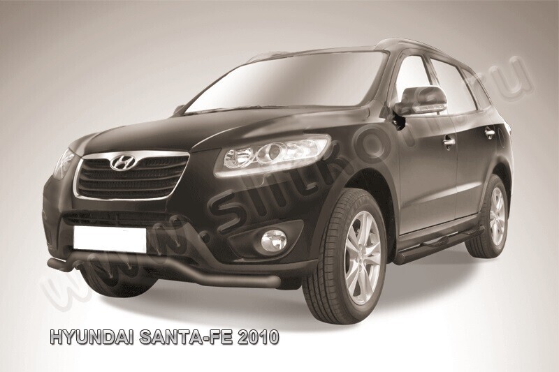 Защита переднего бампера Hyundai Santa-Fe (2009-2012) состоит из изогнутой трубы, изготовленной из нержавеющей стали диаметром 57 мм. Надежное крепление к кузову автомобиля. Установка без сверления кузова. Цвет окраски: черный. Изготовление по предварительному заказу. Гарантия качества!