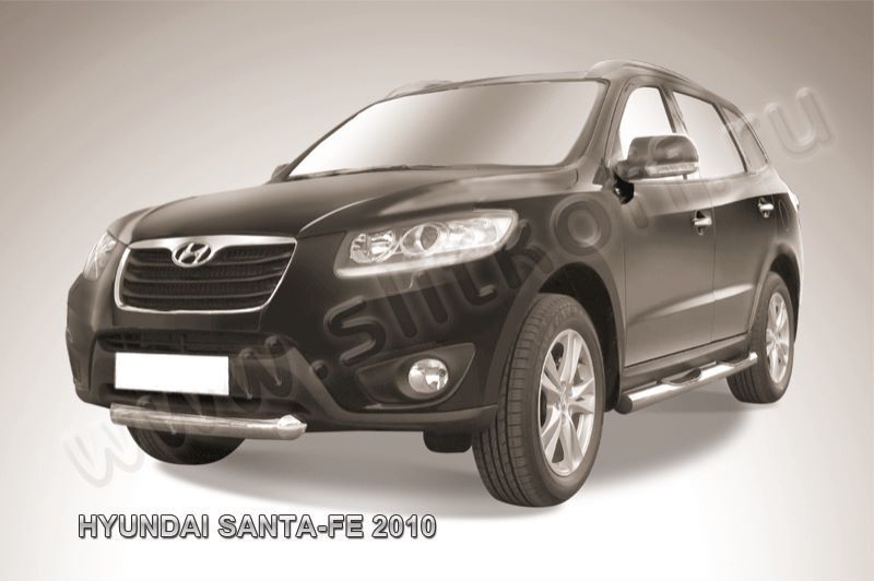 Защита переднего бампера Hyundai Santa-Fe (2009-2012) состоит из трубы, изготовленной из нержавеющей стали диаметром 76 мм. Надежное крепление к кузову автомобиля. Установка без сверления кузова. Изготовление по предварительному заказу. Гарантия качества!