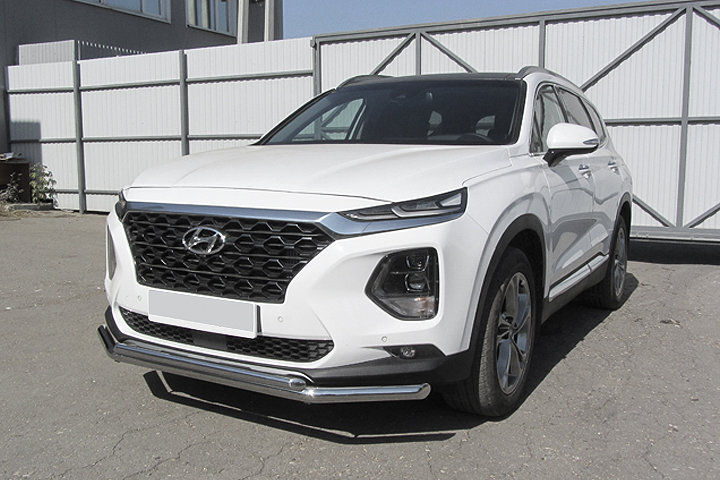 Защита переднего бампера Hyundai Santa-Fe (2018-2021) состоит из 2-х труб, изготовленных из нержавеющей стали диаметрами 57 и 42 мм.Надежное крепление к кузову автомобиля. Установка без сверления кузова. Изготовление по предварительному заказу. Гарантия качества!