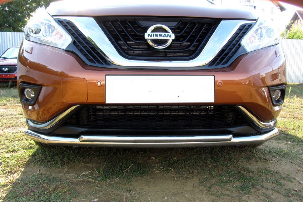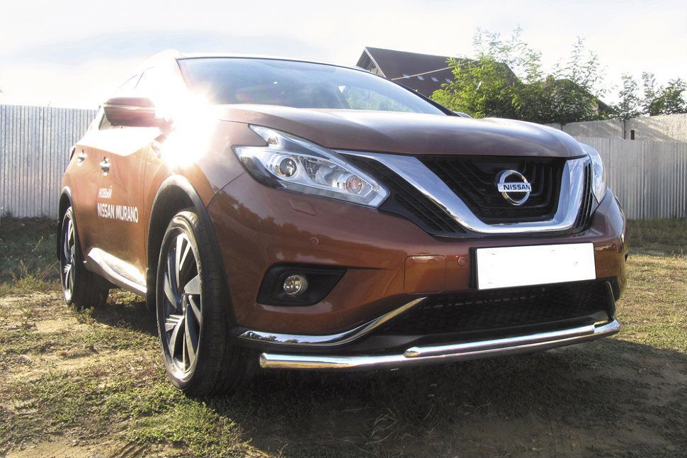 Защита переднего бампера Nissan Murano (2014-2023) состоит из 2-х труб, изготовленных из нержавеющей стали диаметрами 57 и 42 мм. Надежное крепление к кузову автомобиля. Установка без сверления кузова. Изготовление по предварительному заказу. Гарантия качества!