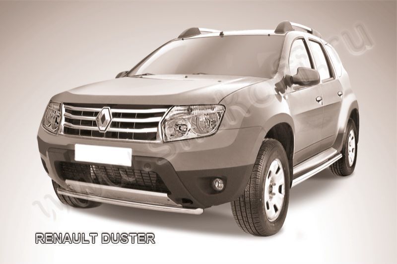 Защита переднего бампера Renault Duster (2010-2015) состоит из трубы, изготовленной из нержавеющей стали диаметром 42 мм. Надежное крепление к кузову автомобиля. Установка без сверления кузова. Изготовление по предварительному заказу. Гарантия качества!