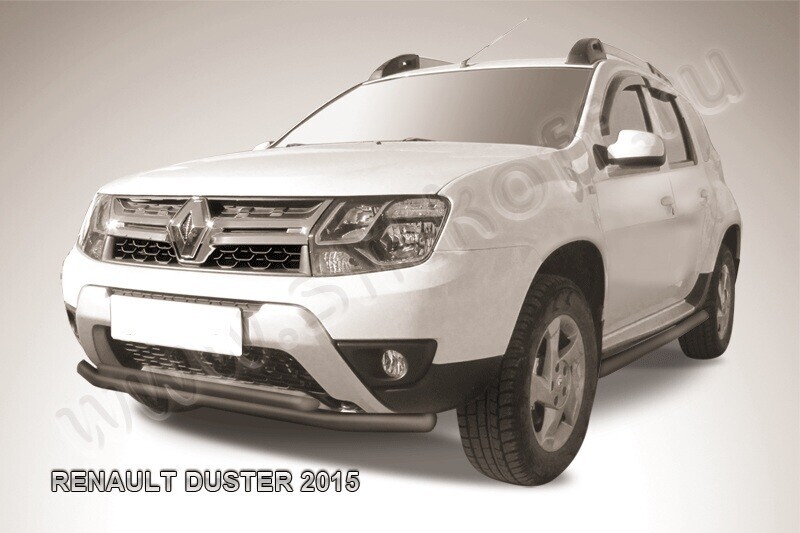 Защита переднего бампера Renault Duster (2015-2021) состоит из 2-х труб, изготовленных из нержавеющей стали диаметрами 57 и 42 мм. Надежное крепление к кузову автомобиля. Установка без сверления кузова. Цвет окраски: черный. Изготовление по предварительному заказу. Гарантия качества!