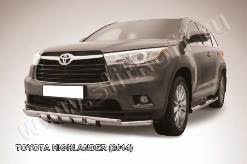 Защита переднего бампера Toyota Highlander (2014-2016) состоит из 2-х труб, изготовленных из нержавеющей стали диаметрами 57 и 42 мм. с профильной защитой картера. Надежное крепление к кузову автомобиля. Установка без сверления кузова. Изготовление по предварительному заказу. Гарантия качества!
