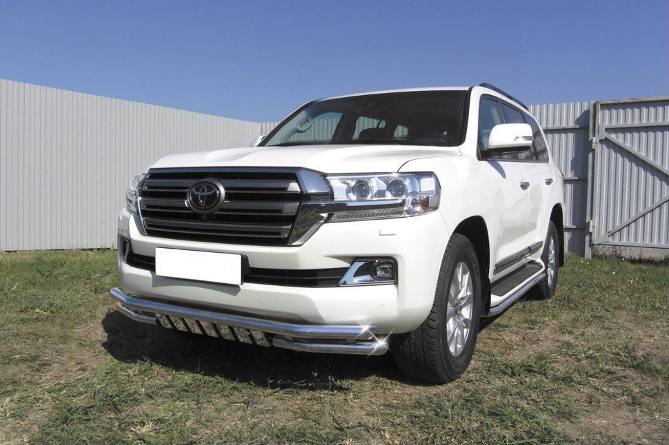 Защита переднего бампера Toyota Land Cruiser 200 (2015-2021) состоит из 2-х труб, изготовленных из нержавеющей стали диаметрами 57 и 57 мм.с защитой картера. Надежное крепление к кузову автомобиля. Установка без сверления кузова. Цвет окраски: черный. Изготовление по предварительному заказу. Гарантия качества!