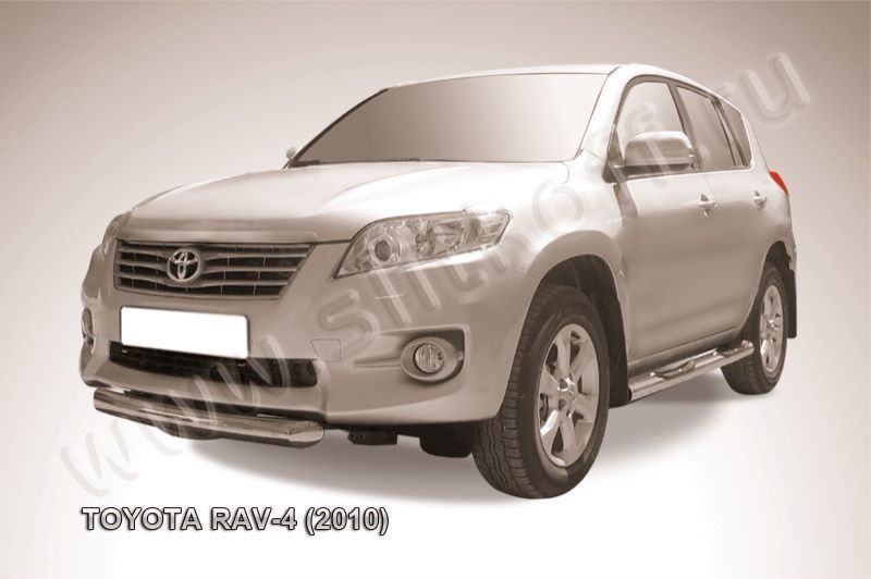 Защита переднего бампера Toyota Rav-4 (2010-2016) состоит из трубы, изготовленной из нержавеющей стали диаметром 76 мм. Надежное крепление к кузову автомобиля. Установка без сверления кузова. Изготовление по предварительному заказу. Гарантия качества!