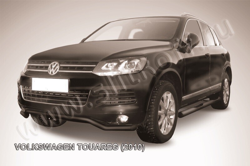 Защита переднего бампера Volkswagen Touareg (2010-2014) состоит из изогнутой трубы, изготовленной из нержавеющей стали диаметром 57 мм. Надежное крепление к кузову автомобиля. Установка без сверления кузова. Цвет окраски: черный. Изготовление по предварительному заказу. Гарантия качества!