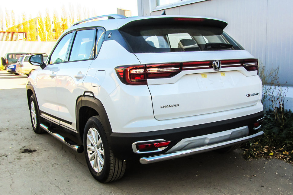 Защита заднего бампера Changan CS35Plus (2018-2023) состоит из трубы, изготовленной из нержавеющей стали диаметром 57 мм. Надежное крепление к кузову автомобиля. Установка без сверления кузова. Изготовление по предварительному заказу. Гарантия качества!