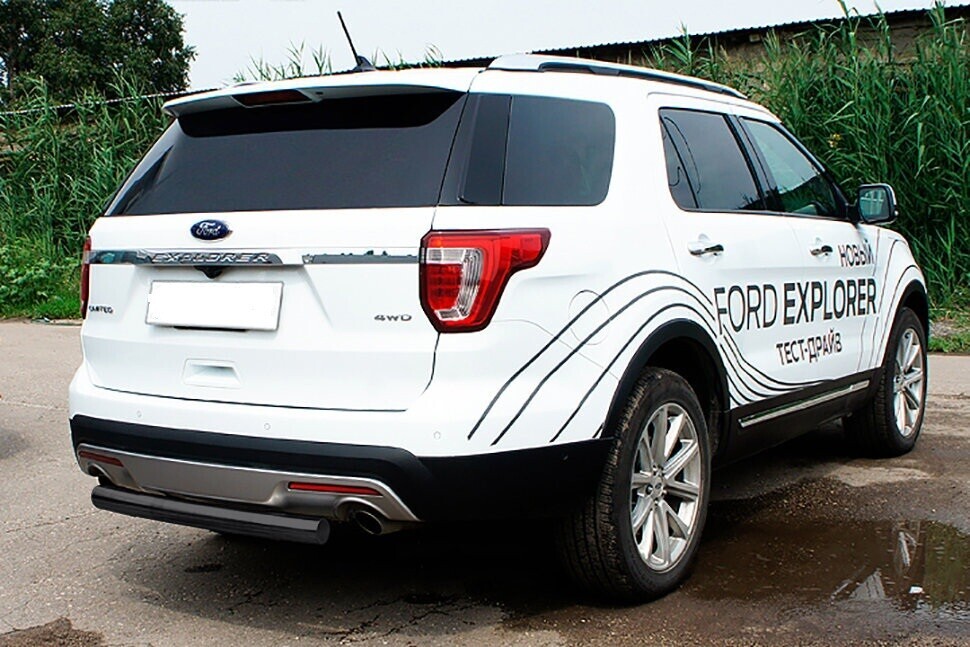 Защита заднего бампера Ford Explorer (2017-2019) состоит из трубы, изготовленной из нержавеющей стали диаметром 76 мм. Надежное крепление к кузову автомобиля. Установка без сверления кузова. Цвет окраски: черный. Изготовление по предварительному заказу. Гарантия качества!