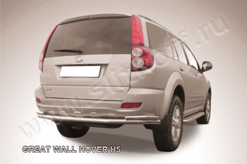 Защита заднего бампера Great Wall Hover H5 (2010-2017) состоит из 2-х труб, изготовленных из нержавеющей стали диаметрами 57 и 42 мм. Надежное крепление к кузову автомобиля. Установка без сверления кузова. Изготовление по предварительному заказу. Гарантия качества!