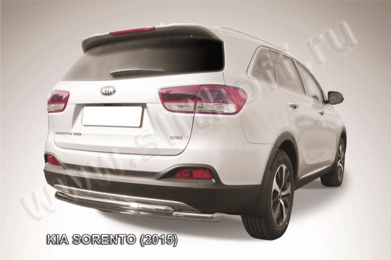 Защита заднего бампера Kia Sorento (2014-2017) состоит из 2-х изогнутых труб, изготовленных из нержавеющей стали диаметрами 57 и 42 мм. Надежное крепление к кузову автомобиля. Установка без сверления кузова. Изготовление по предварительному заказу. Гарантия качества!