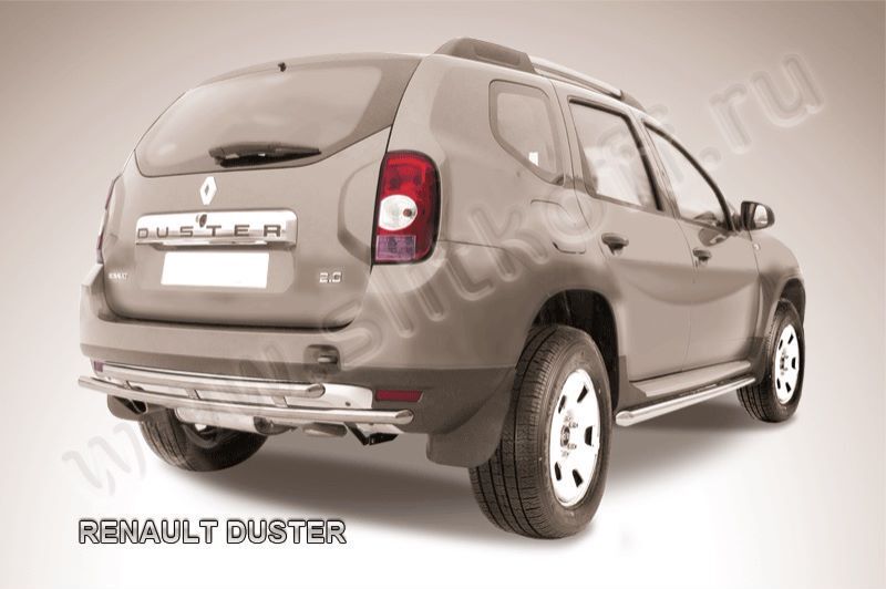 Защита заднего бампера Renault Duster (2010-2015) состоит из 2-х труб, изготовленных из нержавеющей стали диаметрами 42 и 42 мм. Надежное крепление к кузову автомобиля. Установка без сверления кузова. Изготовление по предварительному заказу. Гарантия качества!