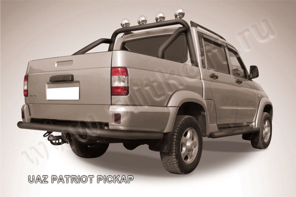 Защита заднего бампера Uaz Pickup (2008-2014) состоит из трубы, изготовленной из нержавеющей стали диаметром 76 мм. Надежное крепление к кузову автомобиля. Установка без сверления кузова. Цвет окраски: черный. Изготовление по предварительному заказу. Гарантия качества!